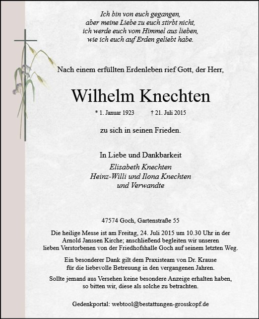 Es war meinem Bruder, meiner Schwägerin und mir ein Trost, zu erfahren, wie viel Freundschaft, Zuneigung und Wertschätzung unserem Vater zuteil geworden ist. Für das Geleit auf dem letzten irdischen Weg, die vielen persönlichen Briefe, die tröstenden Worte, die schweigende Umarmung, Blumen, Kränze und Geldspenden, danke, dass Ihr da wart, jeder auf seine Art. Wir waren überwältigt von der großen Anteilnahme. Sie wird uns auf dem Weg des Schmerzes und der Trauerverarbeitung ganz bestimmt hilfreich sein.Vielen lieben Dank.